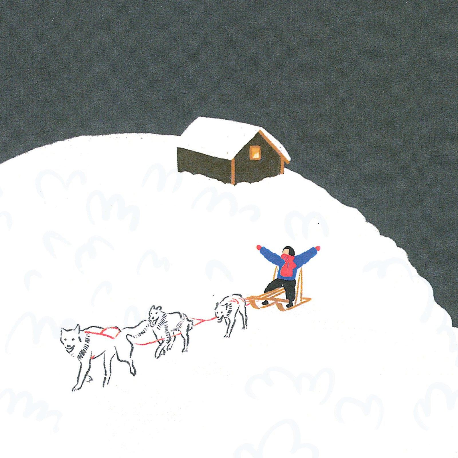 Invite the magic of winter into your space with this enchanting art print: a snowy rice hill crowned by a glowing wooden cabin, where a sledder and three joyful dogs play down the slope. Perfect for those who treasure the warmth of winter memories and the season’s cheerful spirit.