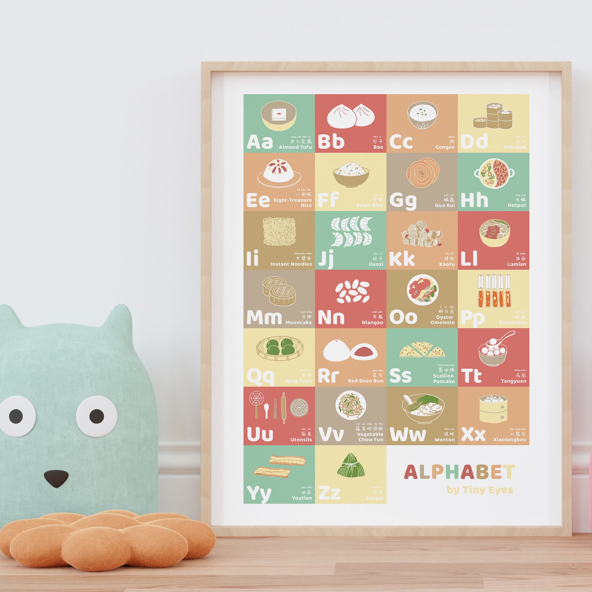 A gift for Chinese food lovers and a fun and educational poster for kids to learn the alphabet and discover Chinese culture at the same time. Perfect for small school beginners, preschoolers or simply as a colorful children's room decoration.